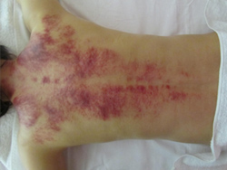 かっさ(白いの薄い石のようなもの)で、患部の皮膚をこすり、体外に毒素を排出。最初は、痛いが、後は、痛くない。