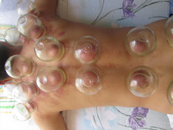 円形状のビンのカップを患部にあて、火で中を真空状態にすると徐徐に皮膚が、もちのように膨らむ。吸収力の作用で体内の毒素を除去します。